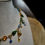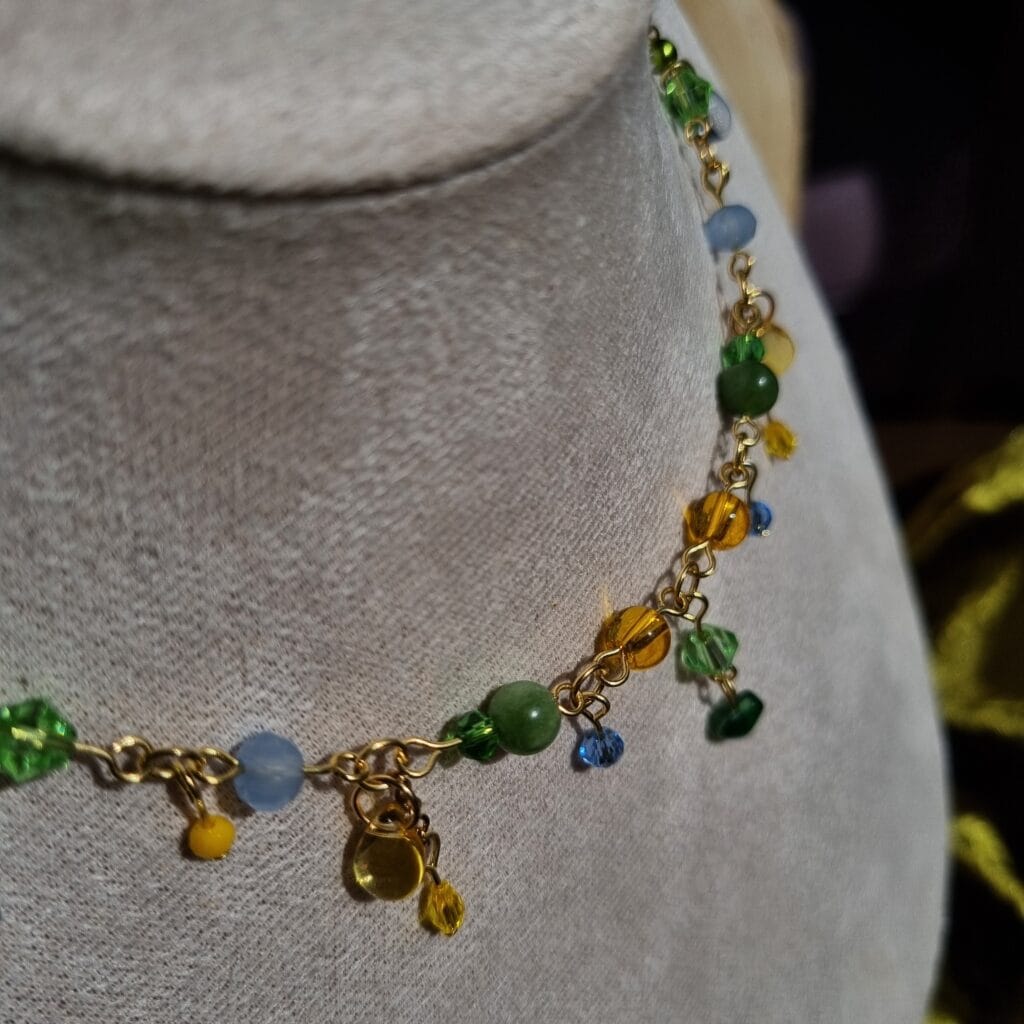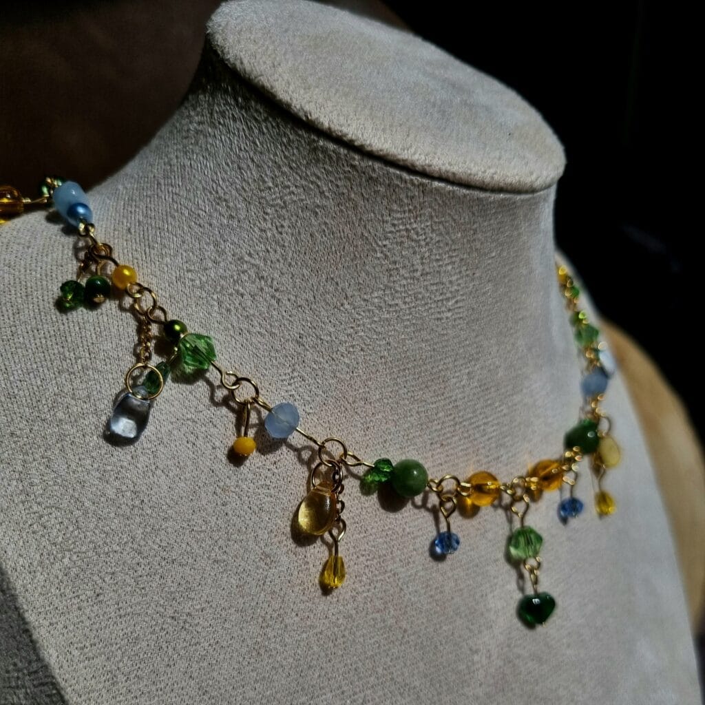Handgemaakte ketting van (gold-plated) roestvrij staal en kralen van glas.