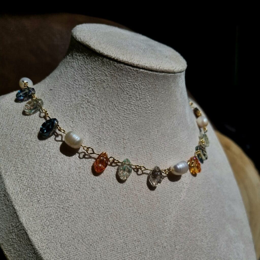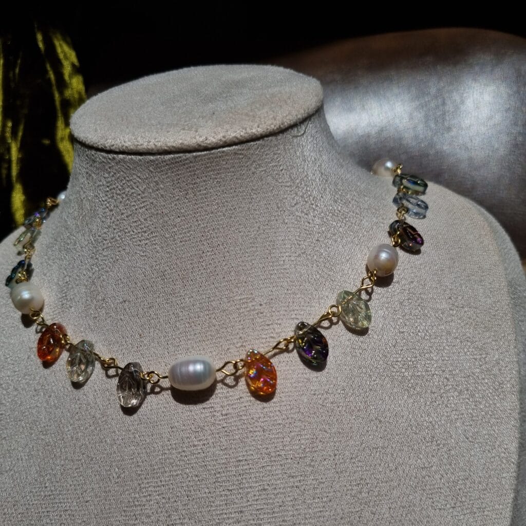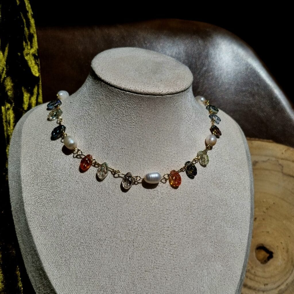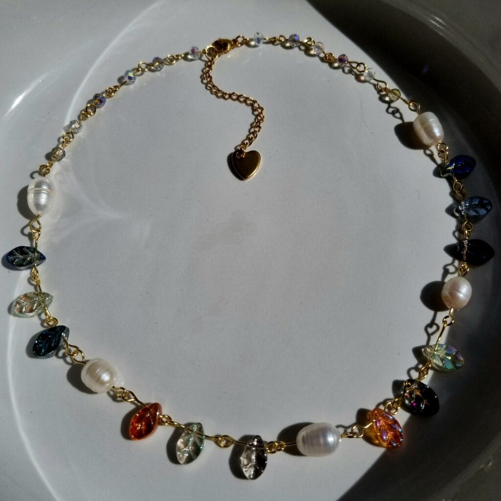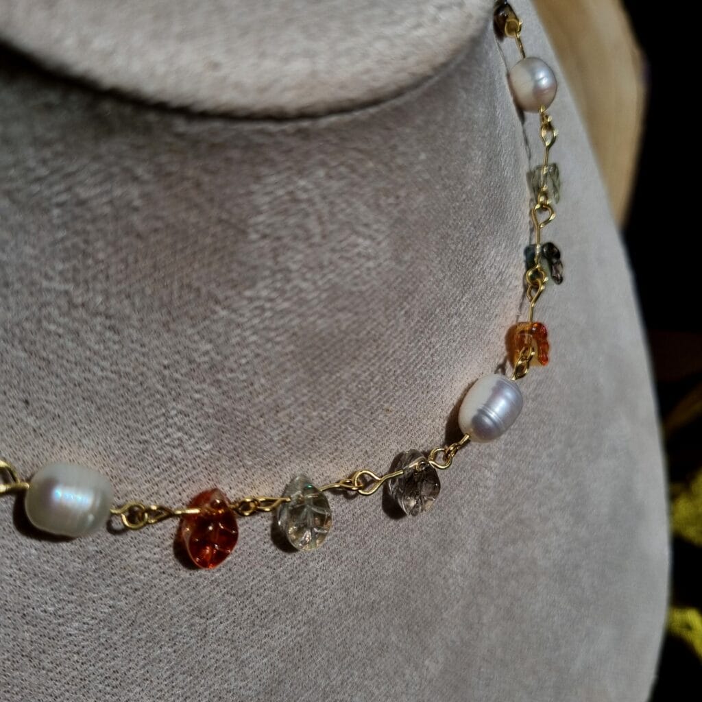 Handgemaakte ketting van (gold-plated) roestvrij staal en kralen van glas en echte zoetwaterparels.