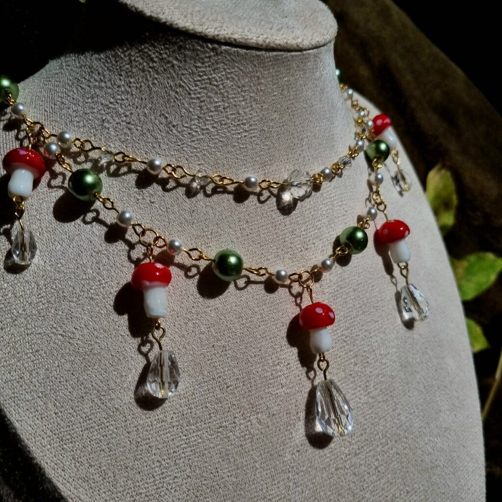 Handgemaakte ketting van (gold-plated) roestvrij staal en kralen van glas en lampwork.
