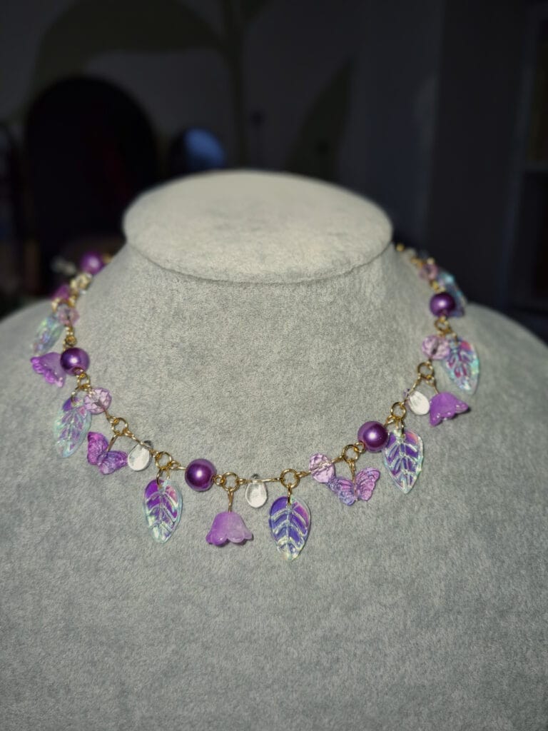Vraag: een variatie op mijn herfstketting, maar dan in paarstinten, en met vlindertjes.