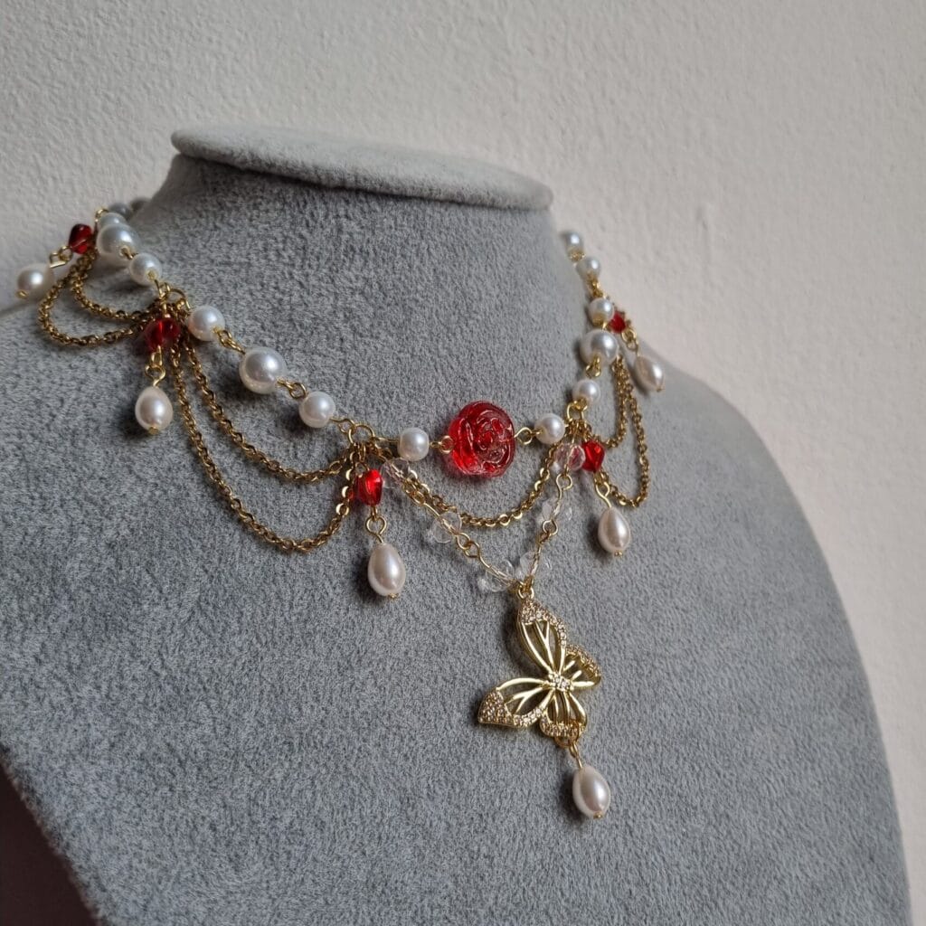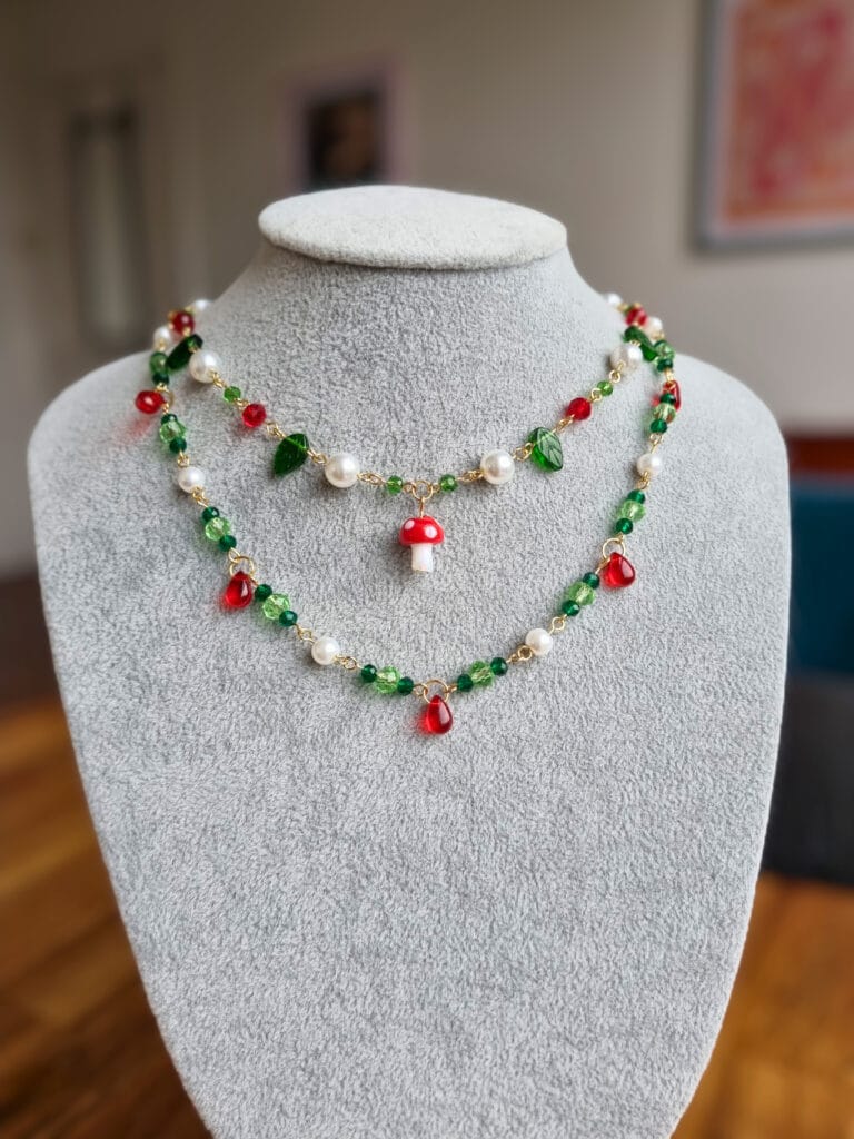 Vraag: een ketting in natuurtinten en geïnspireerd op het boek Red Queen. Kleuren: aardetinten, groen en rood. Speciale voorkeuren: paddenstoelen en parels.